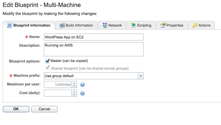 After you name the blueprint, go to the build information tab to specify the type of VM being created along with compute, memory and storage.