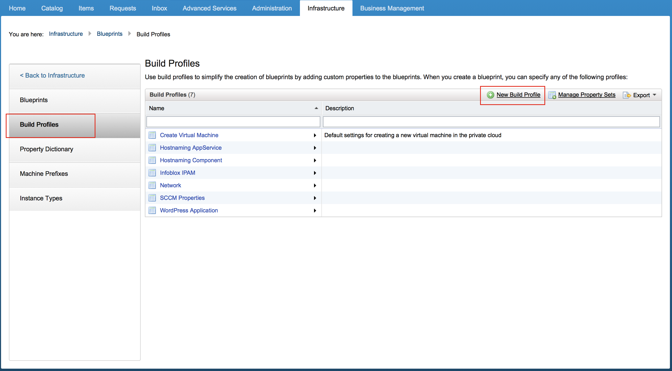 1. A build profile is a group of properties that may be used across blueprints. vRA contains several build profiles out of the box. For example, there is a build profile that provides default properties to be used with SCCM.