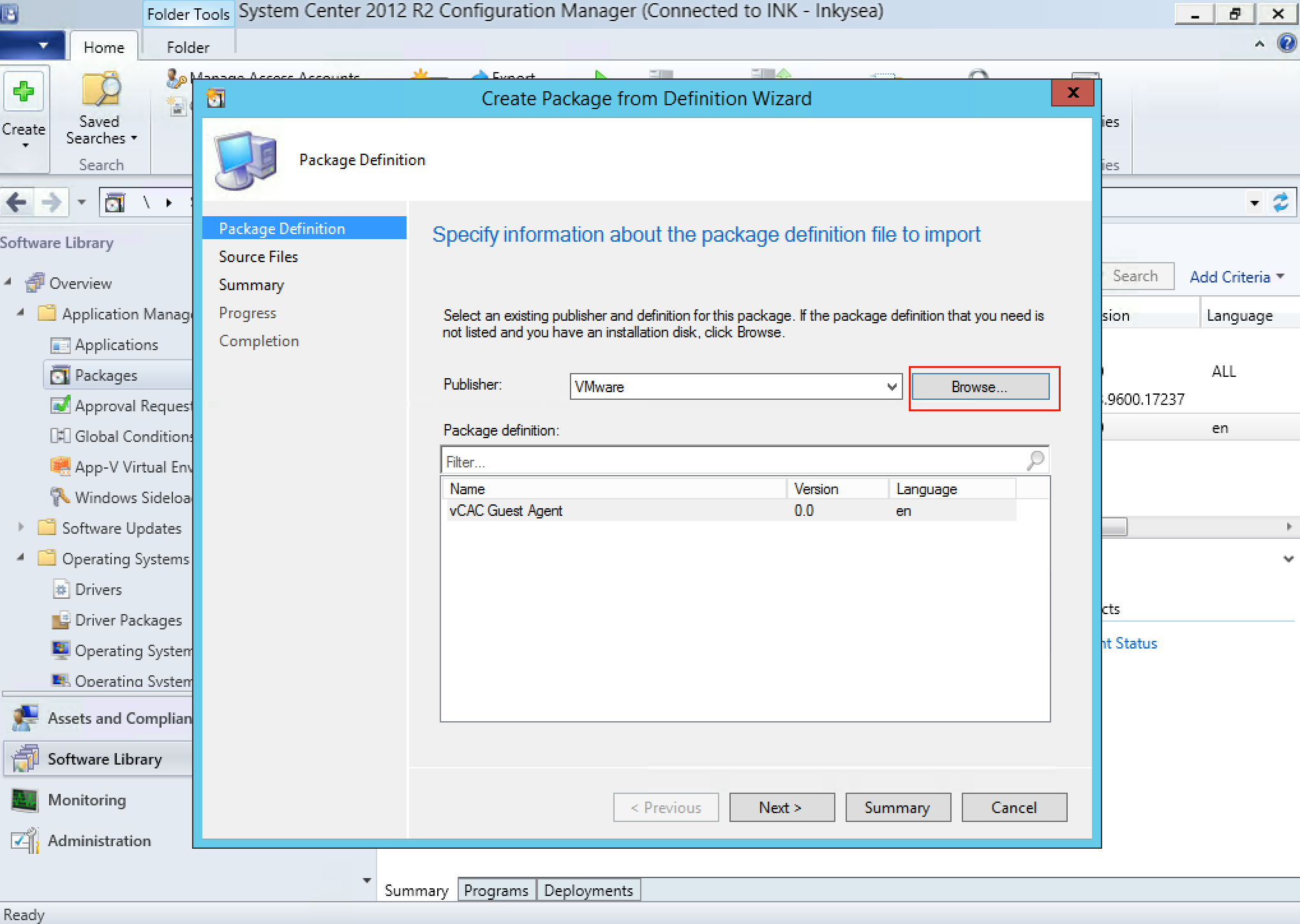 Create an SCCM package for the vRA guest agent. Ensure that you are creating the package using the “Create Package from Definition” option. Use the browse button to select the SCCMPackageDefinitionFile.sms file.