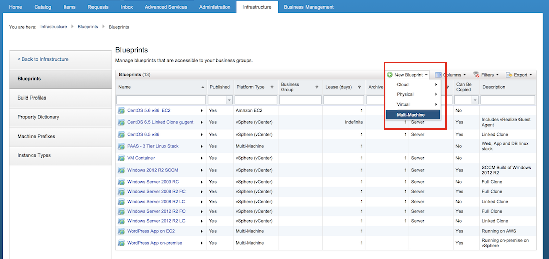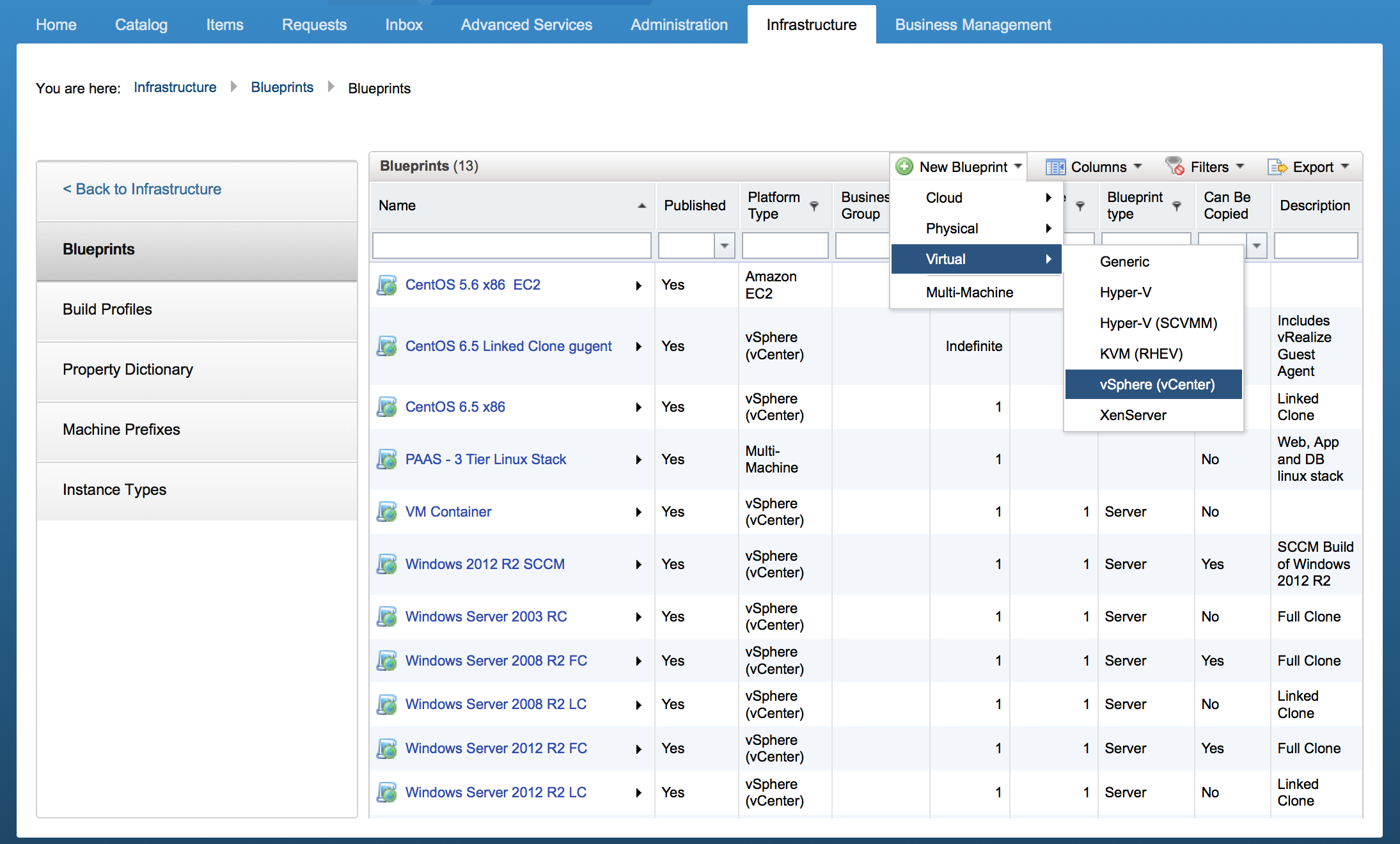 Go to the infrastructure tab, blueprints and select Virtual, vSphere to create a new vSphere blueprint that will leverage SCCM.